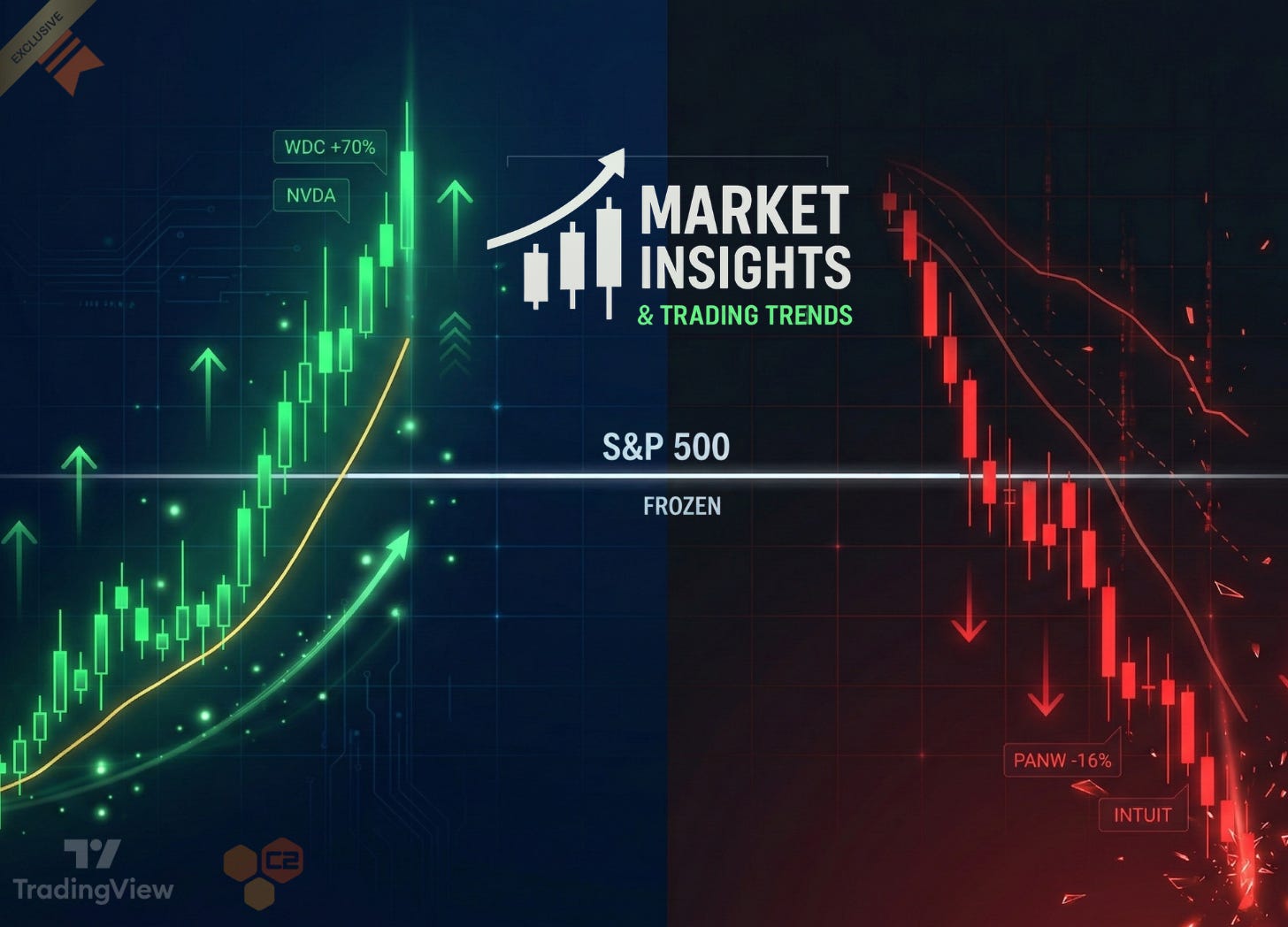 A flat index with massive internal dispersion is the most deceptive environment in trading. It looks calm from the outside, but inside, the machines are redistributing capital at a pace that punishes anyone who isn't paying close attention. Software companies are getting demolished as the market prices in AI disruption. Memory and storage companies are getting bid aggressively as institutions position for AI infrastructure demand. The index averages the two and tells you nothing.